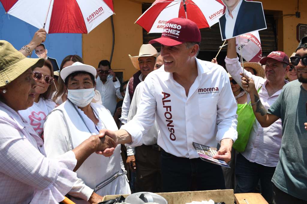 Alfonso Sánchez García realizó un recorrido desde las Escalinatas de los Héroes hasta la Plaza de la Constitución, lugar donde se encontró con los comerciantes anexos a la Iglesia de San José y locatarios de la calle 20 de noviembre, arribando finalmente al mercado municipal como parte de su primer día de gira de campaña.