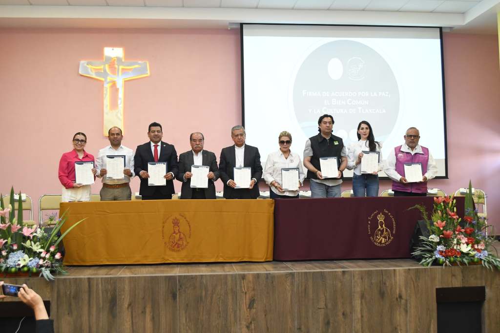 TLAXCALA, Tlax., 9 de mayo de 2024.- Tras el exhorto por la Diócesis de Tlaxcala a los partidos políticos de Tlaxcala a priorizar trabajos de paz y bienestar social durante el proceso electoral del 2024, se llevó a cabo la firma de Acuerdo por la paz, el bien común y la cultura de Tlaxcala.