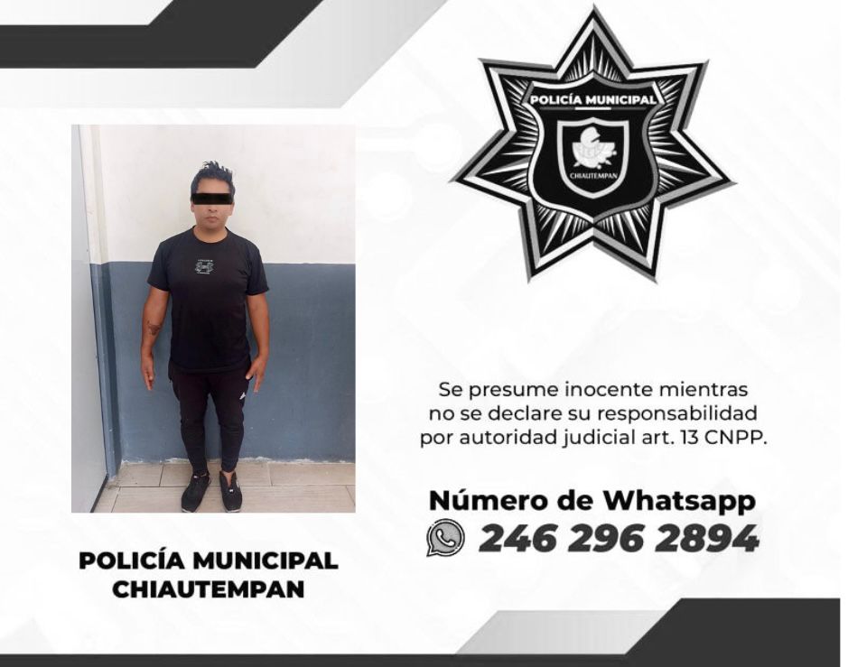 TLAXCALA, Tlax., 13 de mayo de 2024.- Elementos de la Dirección de Seguridad Pública Municipal, Vialidad y Protección Civil de Chiautempan detuvieron a un sujeto por la posesión de un objeto óptimo para agredir en modalidad de arma hechiza.