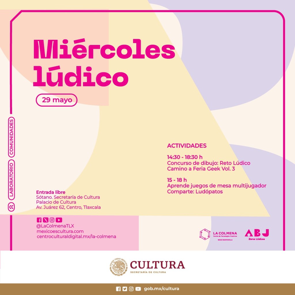 Esta y todas las actividades y ofertas culturales de La Colmena son gratuitas. Para conocer mayor información y la liga de inscripción al concurso, se puede consultar las redes (@LaColmentaTLX) o las páginas web centroculturadigital.mx