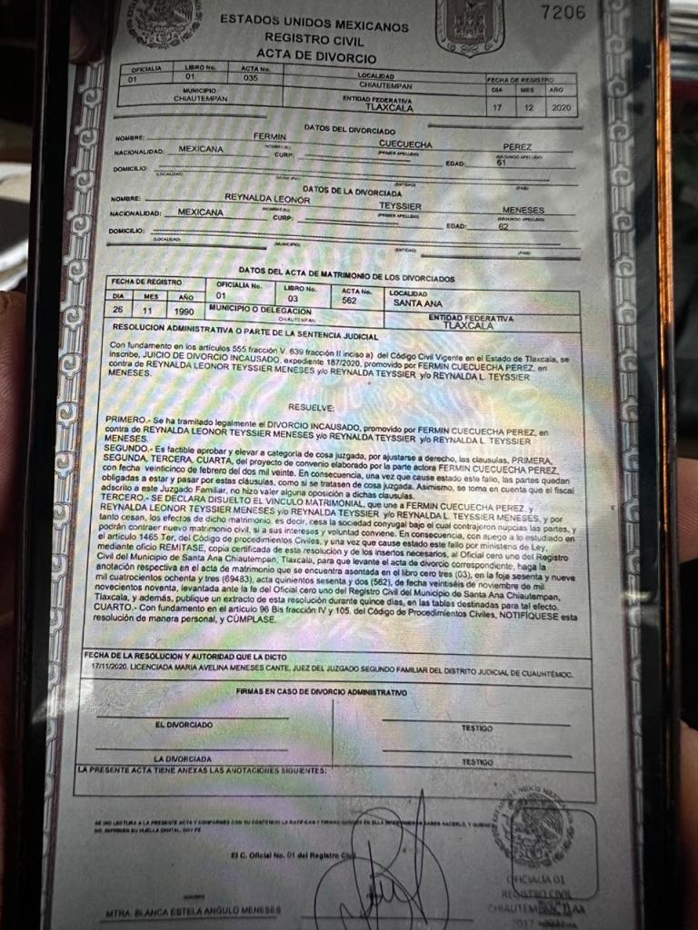 Previo a la elección del 2 de junio, se hizo una acusación pública de Reynalda Leonor Teyssier Meneses a la entonces jueza de Chiautempan, Blanca Estela Ángulo Meneses, que apresuró la demanda de divorcio, que favoreció a su exesposo Fermín Cuecuecha Pérez, sin una orden judicial que decreta la separación matrimonial.