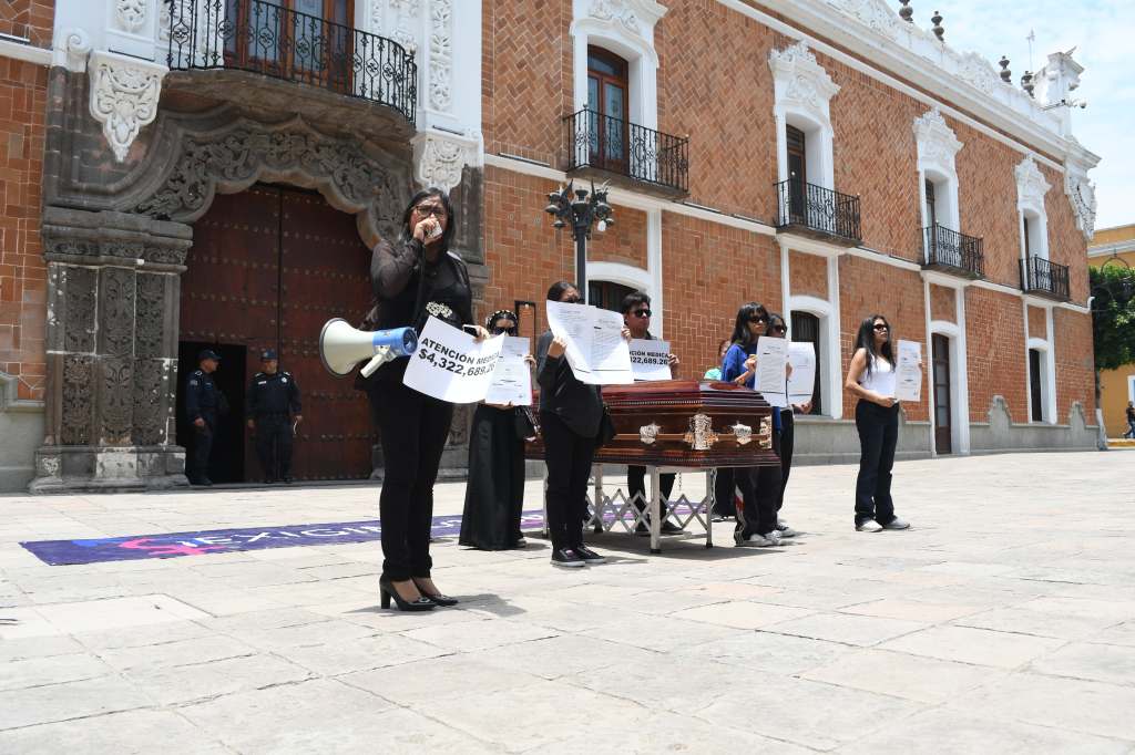 TLAXCALA, Tlax., 4 de junio de 2024.- Familiares y activistas tlaxcaltecas protestaron frente a las instalaciones de Palacio de Gobierno para exigir justicia por Leticia N, trabajadora adscrita al Sindicato 7 de Mayo quien falleció en días recientes por presuntamente negligencia médica y deber una cuenta en el ISSSTE de más de 4 millones de pesos (mdp).
