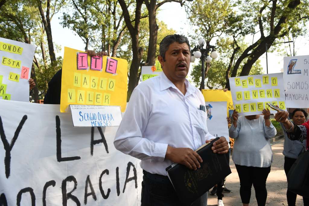 La mañana de este miércoles, Olvera Meneses arribó a la Plaza de la Constitución de la capital tlaxcalteca acompañado de pobladores de Adolfo López Mateos, protestando en contra el ITE con pancartas y consignas a favor del reconocimiento de su victoria como candidato no registrado.