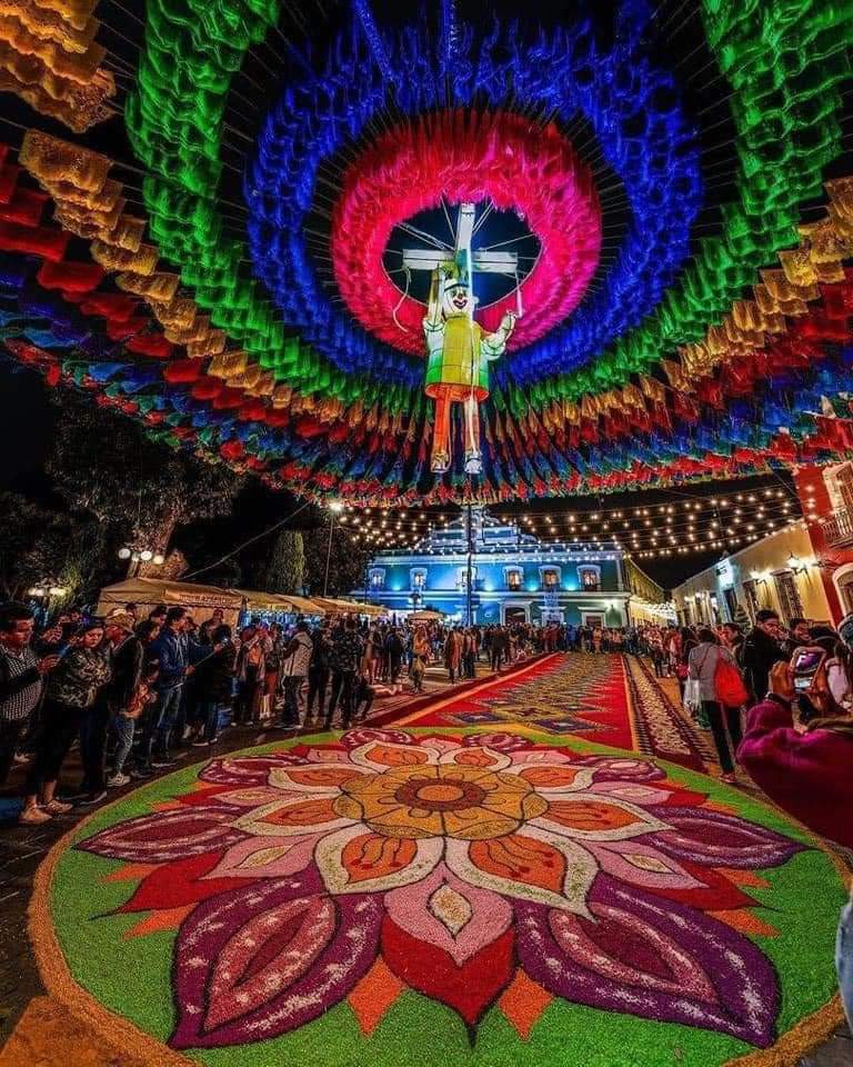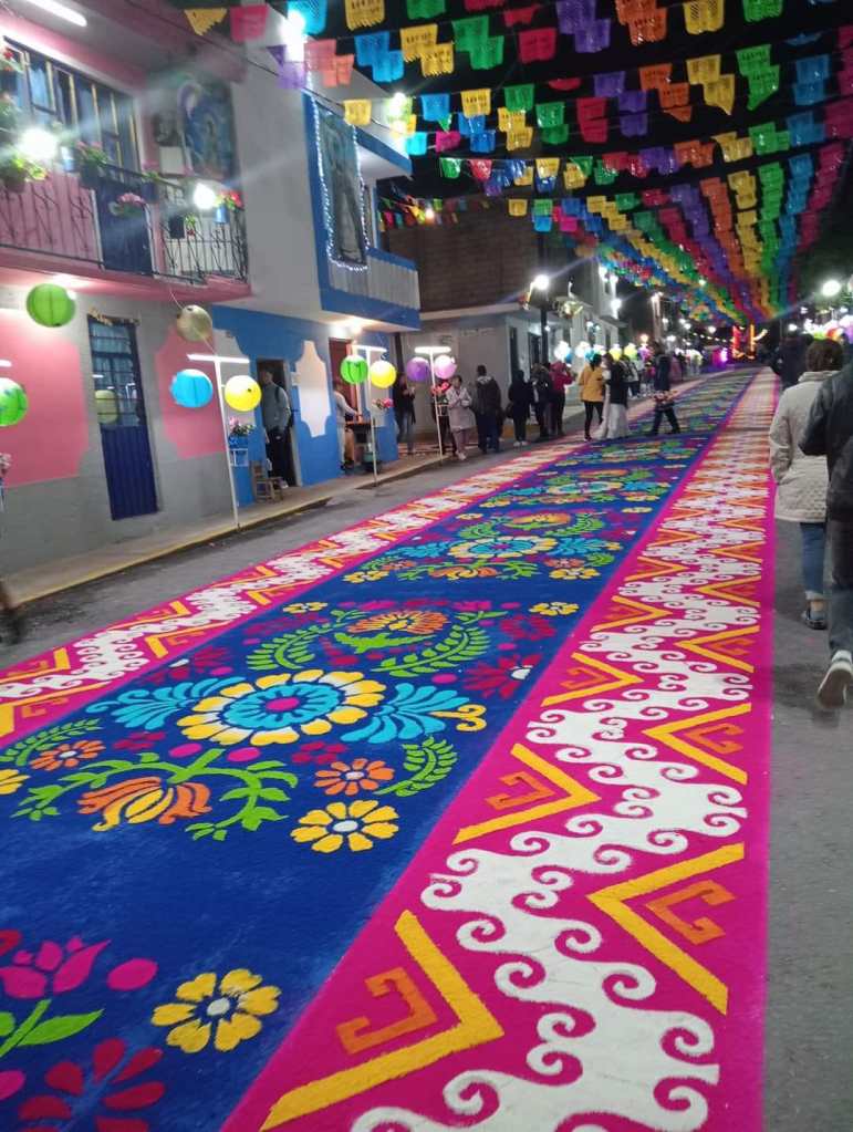 Desde temprana hora del miércoles y a pesar de las condiciones climáticas adversas, artesanos huamantlecos comenzaron con la instalación de las típicas alfombras de arte efímero en honor a la Virgen, siendo uno de los principales atractivos durante la noche y la madrugada de este jueves.