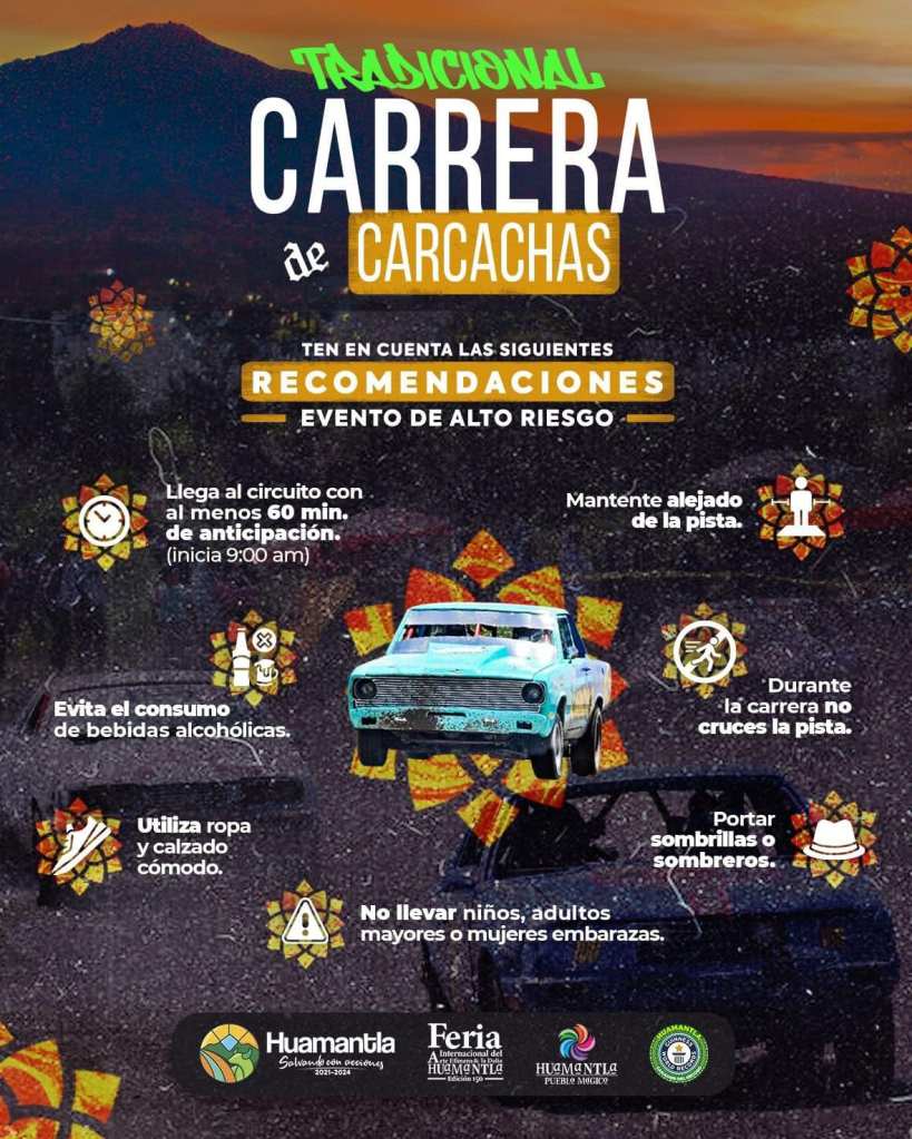 TLAXCALA, Tlax., 23 de agosto de 2024.- Uno de los eventos más emocionantes de la Feria Internacional del Arte Efímero y la Dalia Huamantla 2024, es la tradicional Carrera de Carcachas; por ello, la Coordinación de Protección Civil de Huamantla, emite las siguientes recomendaciones para garantizar una experiencia segura y agradable para todos los asistentes.