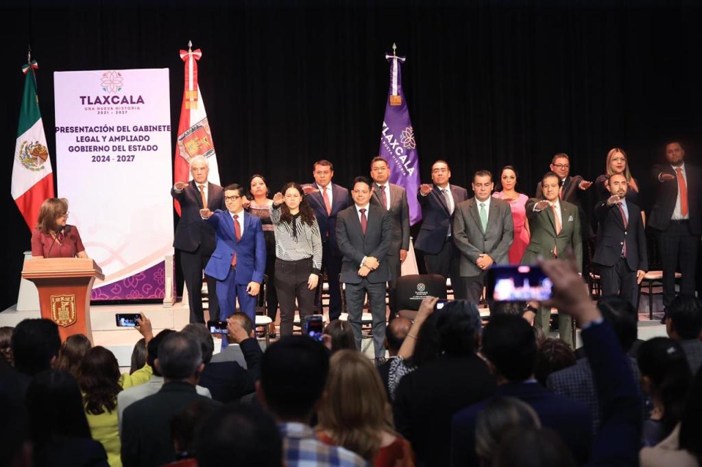 Desde el Teatro Xicohténcatl, la gobernadora Lorena Cuéllar Cisneros, acompañada del secretario de Gobierno, Luis Antonio Ramírez Hernández y del oficial mayor de Gobierno, Ramiro Vivanco Chedraui, encabezó la presentación de los nuevos integrantes del gabinete legal y ampliado del gobierno de Tlaxcala para el periodo 2024-2027.