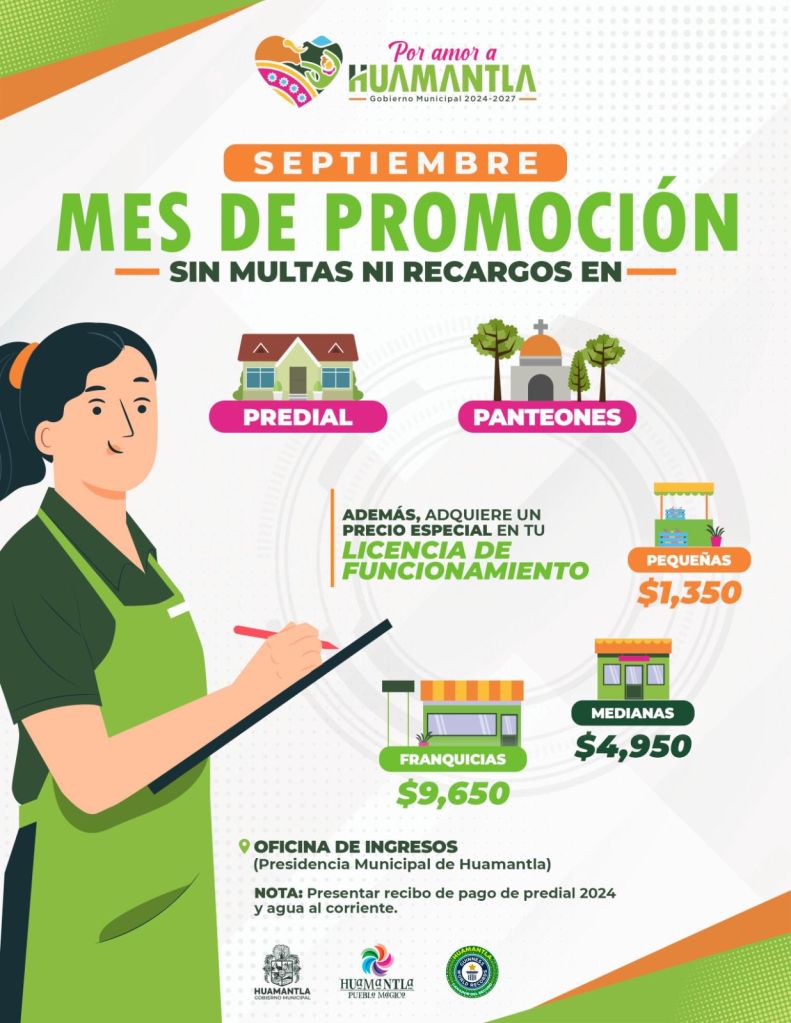 TLAXCALA, Tlax. 12 de septiembre de 2024.- El Ayuntamiento de Huamantla anuncia que todo el mes de septiembre lanzará promociones especiales en el pago de impuestos y permisos en apoyo a la economía familiar y de los comercios.