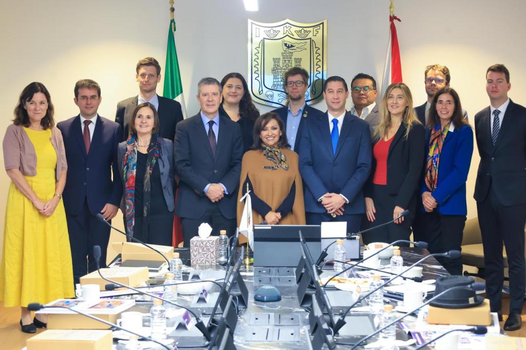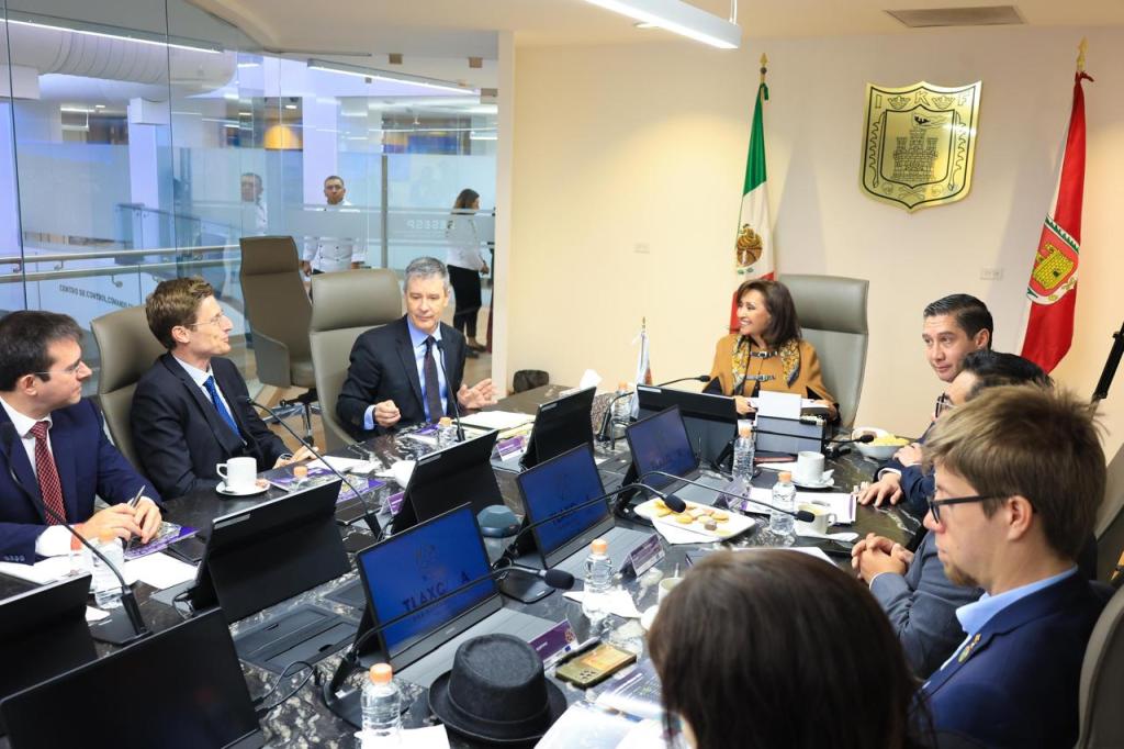 TLAXCALA, Tlax., 23 de octubre de 2024.- La gobernadora de Tlaxcala, Lorena Cuéllar Cisneros, se reunió con integrantes de la delegación de la Unión Europea en México, acompañada por el Secretario de Desarrollo Económico (Sedeco), Javier Marroquín Calderón y otros miembros del gabinete.