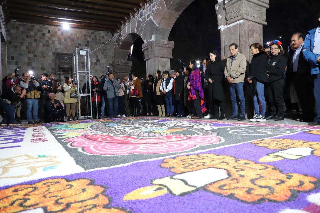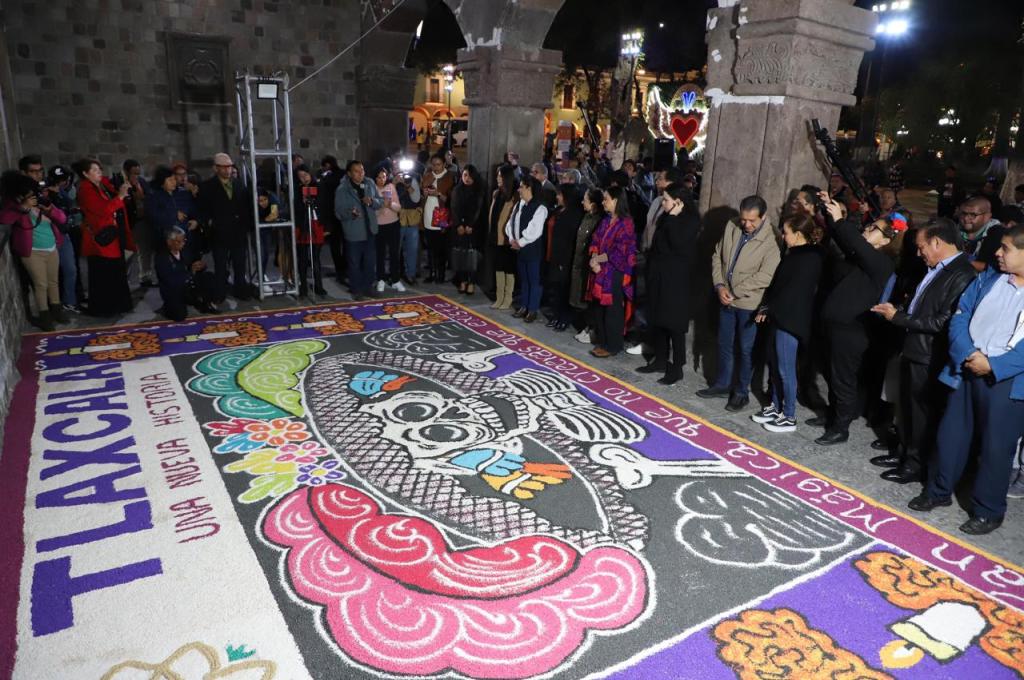 Esta alfombra se puede apreciar en la parte central del Palacio de Gobierno de Tlaxcala. El evento culminó en las Escalinatas de los Héroes, en donde se llevó a cabo el encendido de la iluminación del lugar con motivo de la celebración de Día de Muertos, se realizaron decoraciones relacionadas con las festividades de esta fecha.