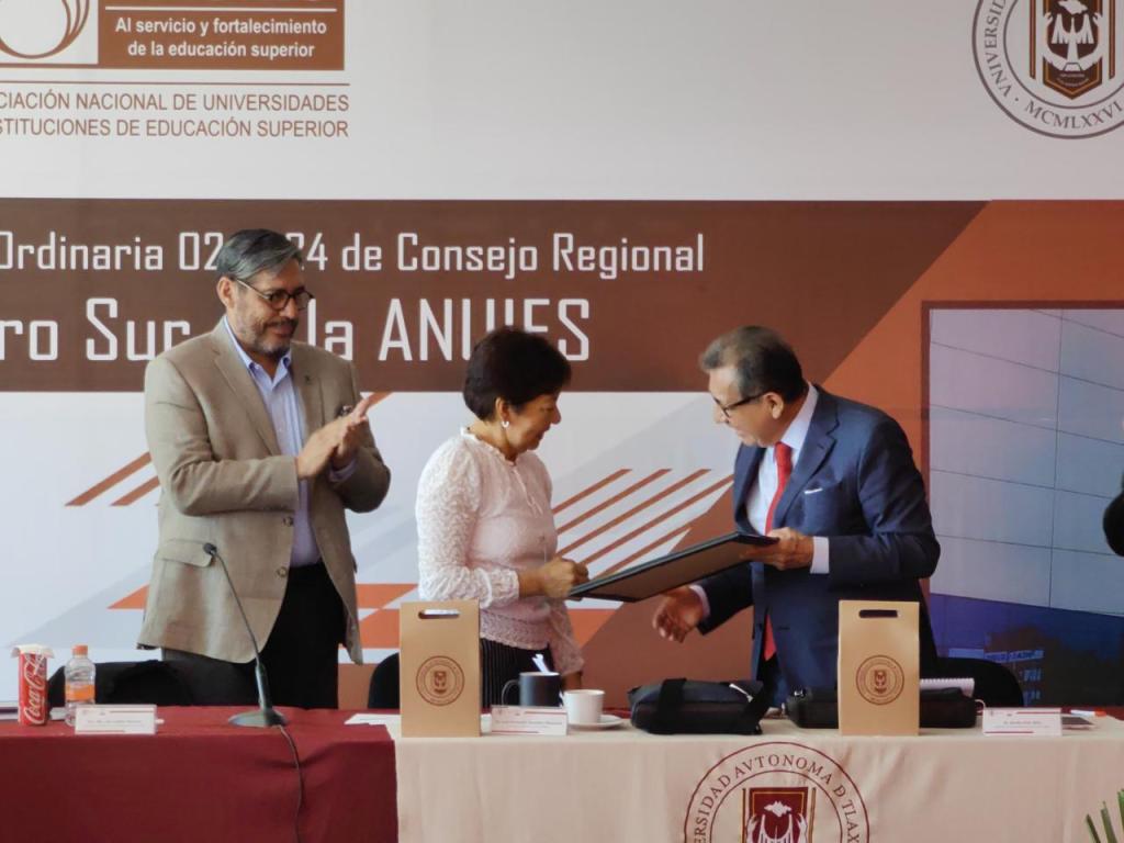TLAXCALA, Tlax., 8 de noviembre de 2024.- El Doctor Serafín Ortiz Ortiz, Rector de la Universidad Autónoma de Tlaxcala (UATx), recibió un reconocimiento que le entregó la Doctora María Lilia Cedillo Ramírez, Rectora de la Benemérita Universidad Autónoma de Puebla (BUAP), por su desempeño en la Presidencia del Consejo Regional Centro-Sur de la Asociación Nacional de Universidades e Instituciones de Educación Superior (ANUIES) a lo largo de cuatro años, en representación de los rectores que integran este organismo, en el marco de la Sesión Ordinaria 02.2024 del Consejo Regional Centro Sur de ANUIES que también presidió el Doctor Luis Armando González Placencia, Secretario General Ejecutivo de la ANUIES.