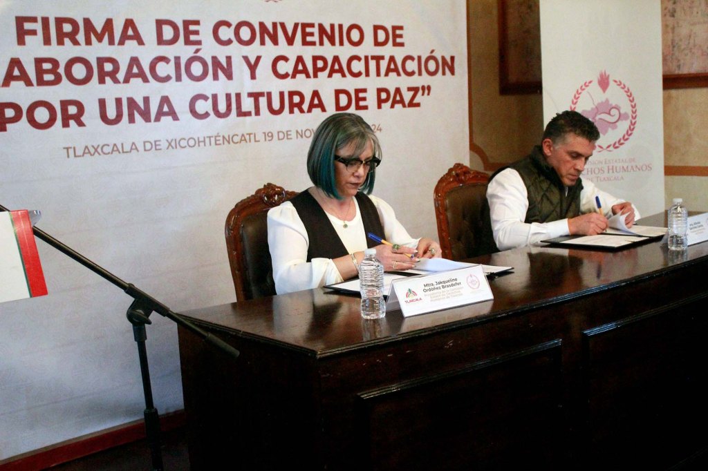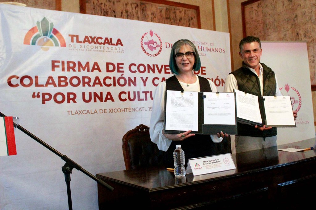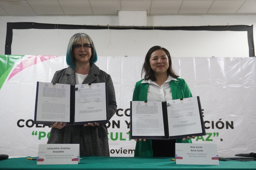 TLAXCALA, Tlax., 20 de noviembre de 2024.- En un esfuerzo por fortalecer a los gobiernos municipales en materia de promoción y garantía al respeto pleno de los Derechos Humanos, la presidenta de la Comisión Estatal de Derechos Humanos de Tlaxcala (CEDHT), Jakqueline Ordoñez Brasdefer, firmó convenios de colaboración y capacitación con la presidenta municipal de San Pablo del Monte, Ana Lucía Arce Luna y con el alcalde de Tlaxcala, Alfonso Sánchez García.