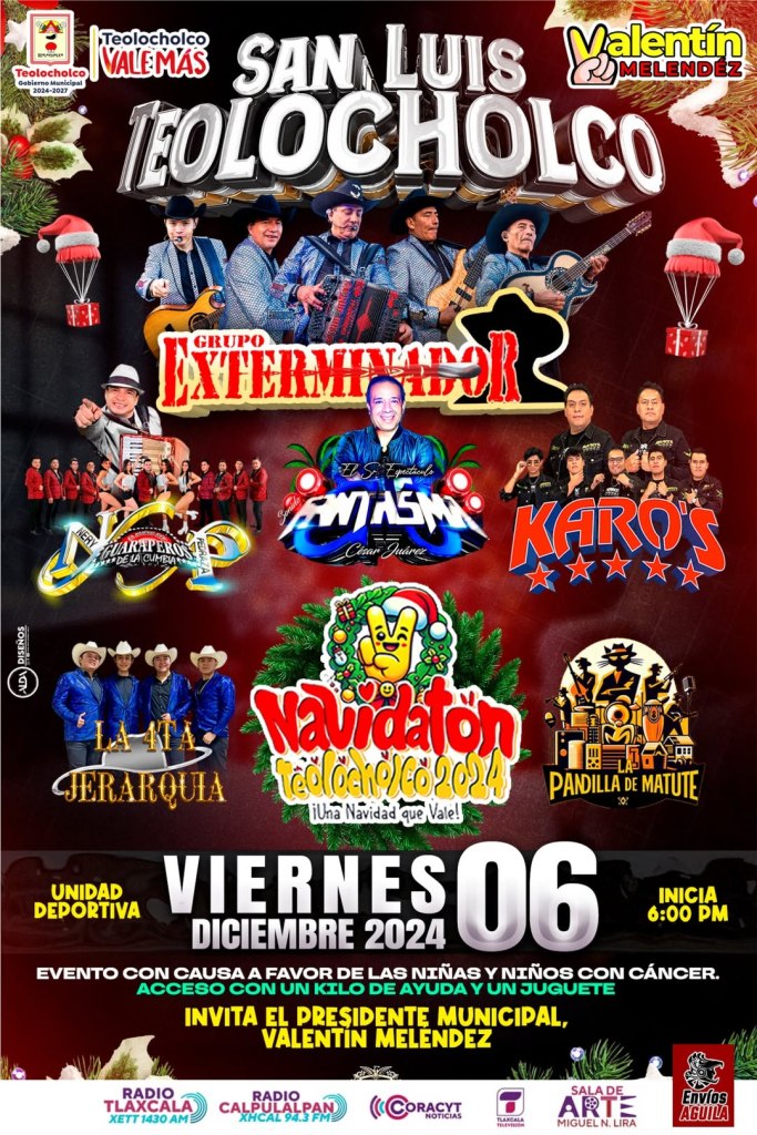 Para este mes de diciembre, en Teolocholco se preparán dos eventos importantes que se enfocan primero en la colecta de víveres y juguetes para este sector vulnerable de la población a través de un baile popular con el Grupo Exterminador y otros más, donde el acceso será un kilo de ayuda.