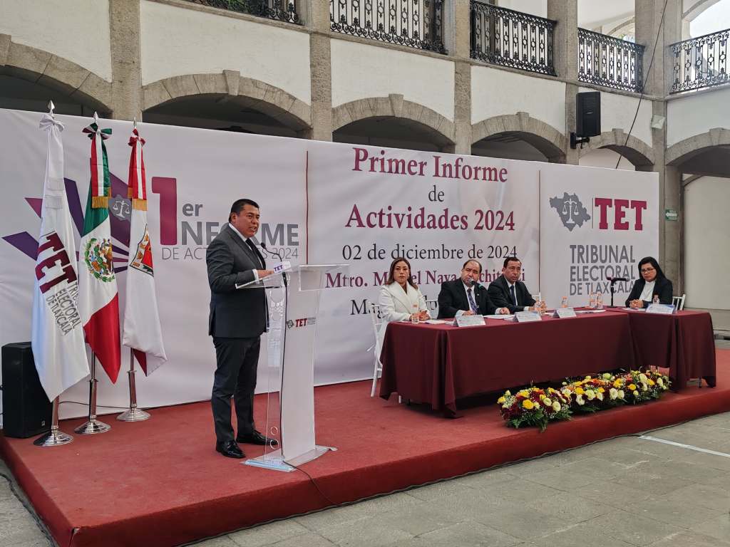 TLAXCALA, Tlax., 2 de diciembre de 2024.- El Magistrado Presidente del Tribunal Electoral de Tlaxcala (TET), Miguel Nava Xochitiotzi, presentó el informe de actividades 2024, el primero de su gestión tras 10 meses al frente del organismo, en el que destacó la efectividad alcanzada en las resoluciones de la actividad jurisdiccional en este año con dos procesos electorales, uno ordinario y otro extraordinario, así como la diversidad de acciones emprendidas en materia de capacitación, con lo que se garantizó la protección de los derechos político-electorales de la ciudadanía tlaxcalteca.