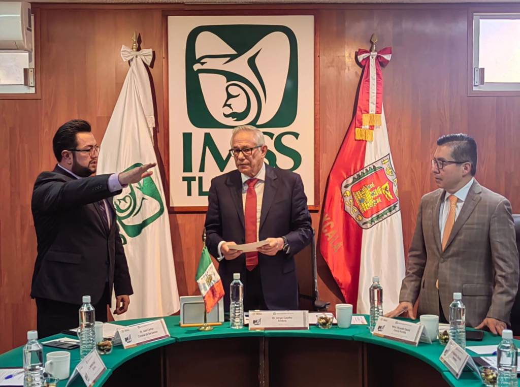 En la primera sesión extraordinaria del Consejo Consultivo del OOAD Tlaxcala, encabezada por el secretario general del IMSS, doctor Jorge Gaviño Ambriz, se tomó la protesta como presidente del órgano colegiado al doctor Juan Carlos Corona de los Santos, nuevo titular del IMSS en la entidad.