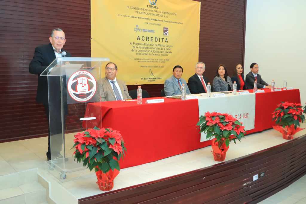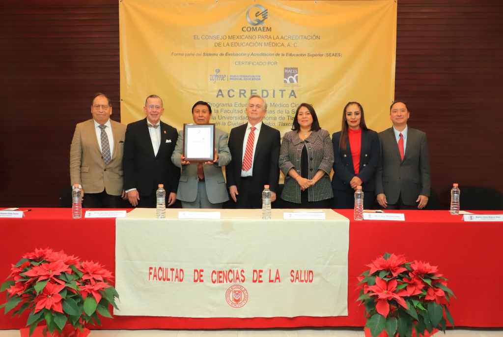 TLAXCALA, Tlax., 12 de diciembre de 2024.- La acreditación de la calidad constituye un compromiso de la Universidad Autónoma de Tlaxcala (UATx) con la excelencia académica y el cumplimiento de nuestra misión por formar capital humano que responda a las necesidades de su entorno, aseguró el Maestro José Reyes Luna Ruíz, Coordinador de la División de Ciencias Biológicas, al recibir la Placa de la segunda Reacreditación de la Licenciatura en Médico Cirujano que otorgó el Consejo Mexicano para la Acreditación de la Educación Médica (COMAEM) para el periodo 2024-2029, organismo que forma parte del Sistema de Evaluación y Acreditación de la Educación Superior (SEAES).