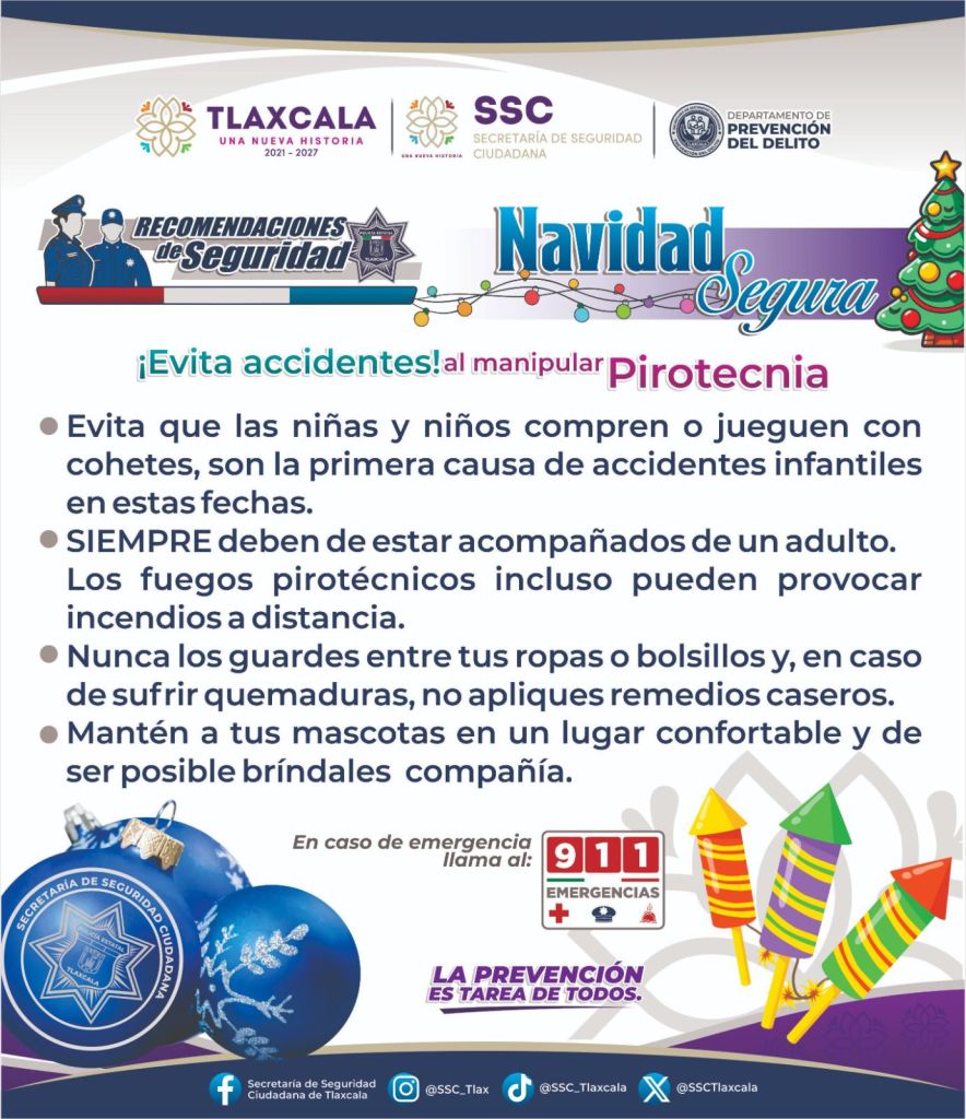 TLAXCALA, Tlax., 24 de diciembre de 2024.- La Secretaría de Seguridad Ciudadana (SSC) emitió una serie de recomendaciones para prevenir accidentes y situaciones de riesgo durante la temporada decembrina