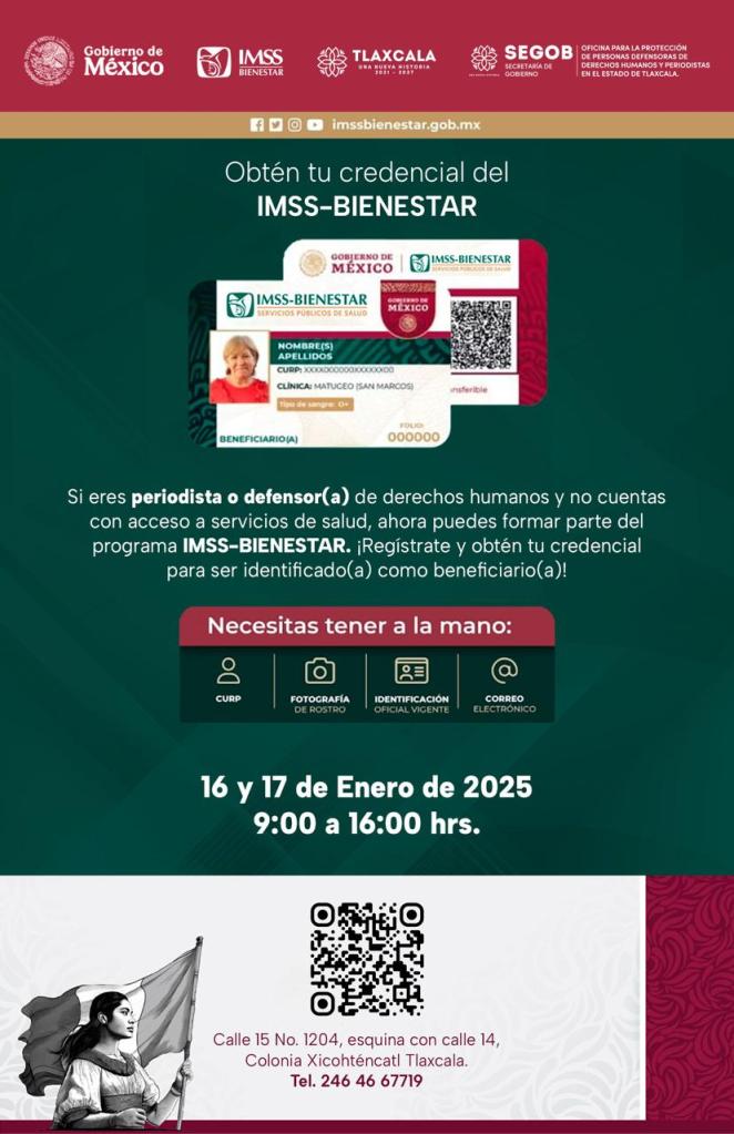TLAXCALA, Tlax., 14 de enero de 2025.- La Secretaría de Gobierno del estado (Segob), a través de la oficina para la protección de personas defensoras de derechos humanos y periodistas, en coordinación con el IMSS-Bienestar, pondrá en marcha la Jornada de Credencialización dirigida a comunicadores y defensores que no cuenten con seguridad social.