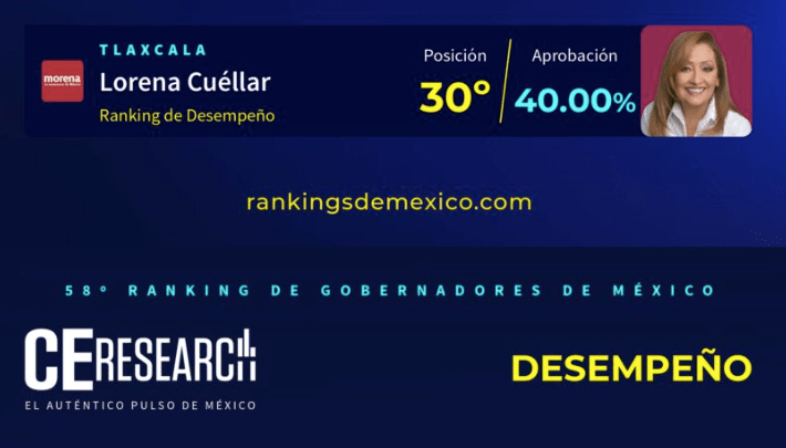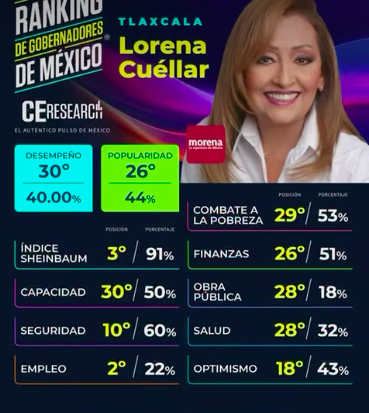 Esta medición mensual, refleja el actuar y desempeño de los gobernadores de México, donde la mandataria tlaxcalteca, Lorena Cuéllar Cisneros, se ubica en penultimo lugar, siendo la segunda peor evaluada a nivel nacional.