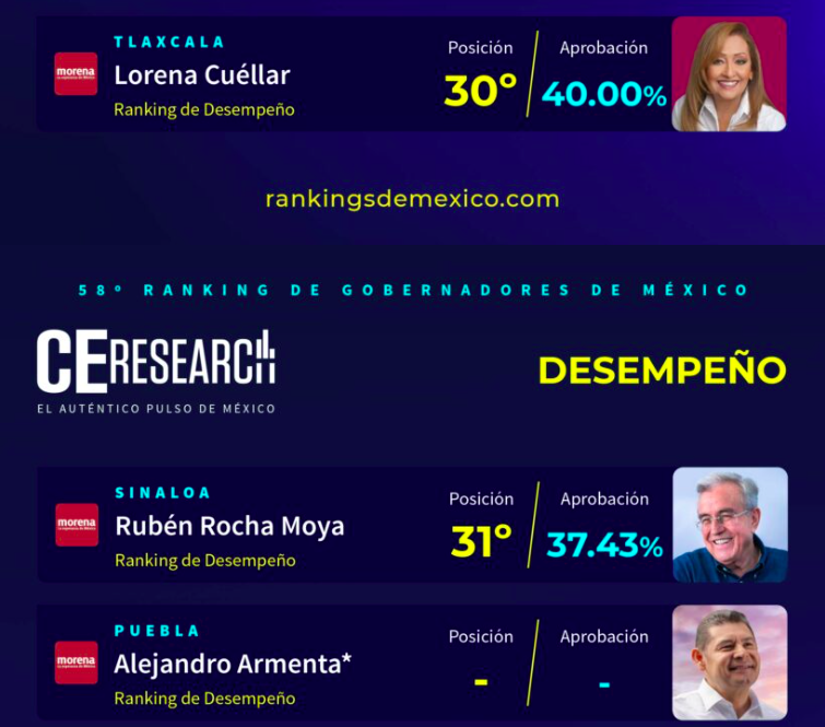 Mientras que los morenistas Rubén Rocha Moya de Sinaloa, Lorena Cuéllar de Tlaxcala y Alfredo Ramírez Bedolla de Michoacán, son los peor evaluados por su trabajo según sus mismos gobernados.