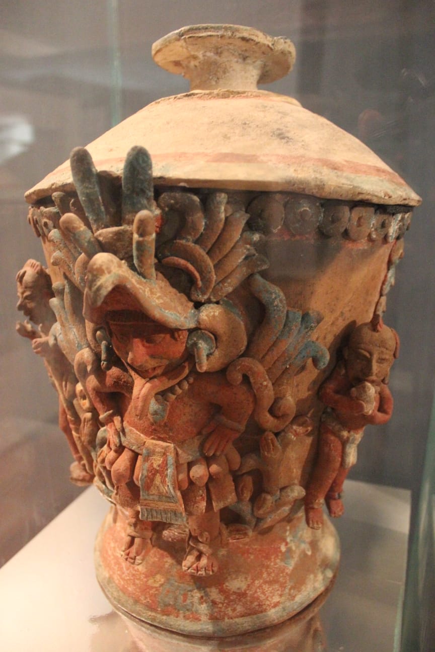 Sobre la pieza cerámica de uso ceremonial, el director del Centro INAH mencionó que la urna policromada fue localizada en la zona arqueológica de Cacaxtla, en Tlaxcala. Sus figuras recrean una escena ritual, en la que destacan tres personajes. Al centro, un individuo con tocado de ave, cinturón de caracoles, orejeras y collar; de sus pies salen dos árboles de cacao estilizados. A sus costados, un personaje toca una trompeta de caracol marino y el otro porta lo que podría ser un cetro, bastón o incluso un palo sembrador, haciendo alusión a la práctica de la agricultura; ambos portan taparrabos, el director del Centro INAH Tlaxcala, De la Rosa Herrera, aseguró que es un elemento muy representativo de la cultura tlaxcalteca