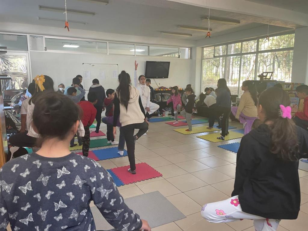 Durante la clase de yoga, impartida por la facilitadora Paula Rendón, los pequeños revitalizaron su energía con posturas como monito, montaña, árbol, mesa, perro, gato, cuna, niño durmiendo, perro boca abajo, niño relajado, niño sonriendo y jugando y serpiente dormida.