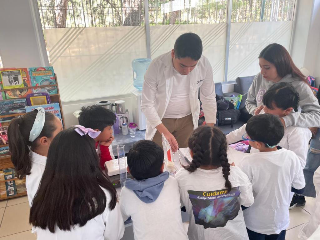 Más tarde, participaron en la actividad “Este viernes somos químicos”, dirigida por los investigadores del Centro Tlaxcala de Biología de la Conducta (CTBC), Laura García Rivera y Miguel Ángel Montiel. En este espacio, los niños exploraron principios básicos de la química mediante la creación de colores con diluciones, la observación del pH y la elaboración de pesos con soluciones sólido-líquido y líquido-líquido.
