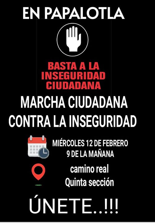 TLAXCALA, Tlax., 12 de febrero de 2025.- Pobladores del municipio de Papalotla de Xicohténcatl marcharon este miércoles en la cabecera de esta comuna para exigir al alcalde, Sergio Lara Muñoz, atender el tema de la inseguridad.