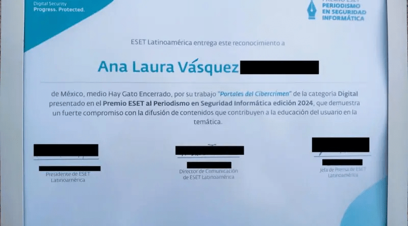 Por este trabajo, Laura Vázquez recibió el Premio ESET al Periodismo sobre Seguridad Informática 2024 en la categoría de Periodismo Digital a nivel Latinoamérica y en representación de México, y es una de las 4 categorías principales que prevé este galardón al periodismo que se hace y ejerce en países de América latina.