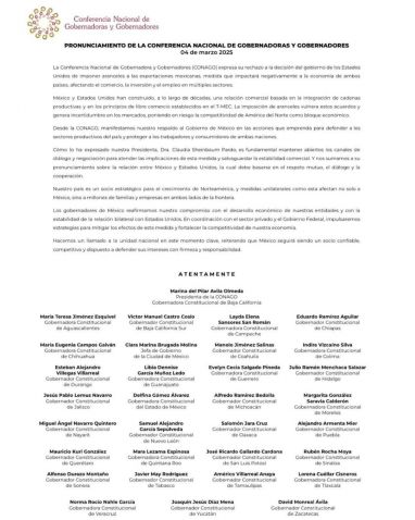 Los gobernadores coinciden en que esta medida unilateral afectará gravemente el comercio, la inversión y el empleo en ambos países, vulnerando los principios del T-MEC y generando incertidumbre en los mercados.