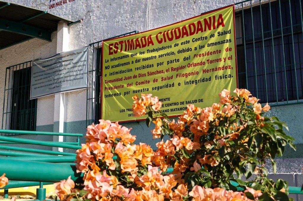 Ante esta situación, la unidad médica se encuentra cerrada y en el acceso fue colocada una lona con un mensaje a la ciudadanía que dice: “Le informamos que los trabajadores de este Centro de Salud, no acudiremos a dar nuestro servicio, debido a las amenazas e intimidación recibidas por parte del presidente de comunidad, Juan de Dios Sánchez, el regidor Orlando Torres y el presidente del comité de salud, Filogonio Hernández, tememos por nuestra seguridad e integridad física”.