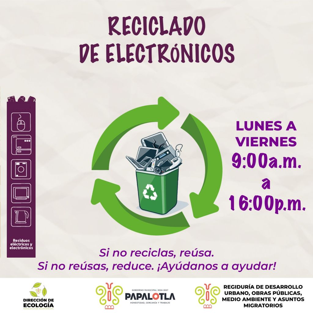 TLAXCALA, Tlax., 25 de abril de 2025.- El Gobierno Municipal de Papalotla 2024-2027, a través de la Dirección de Ecología y la Regiduría de Desarrollo Urbano, Obras Públicas, Medio Ambiente y Asuntos Migratorios, ha puesto en marcha una campaña permanente de reciclaje de dispositivos electrónicos.
