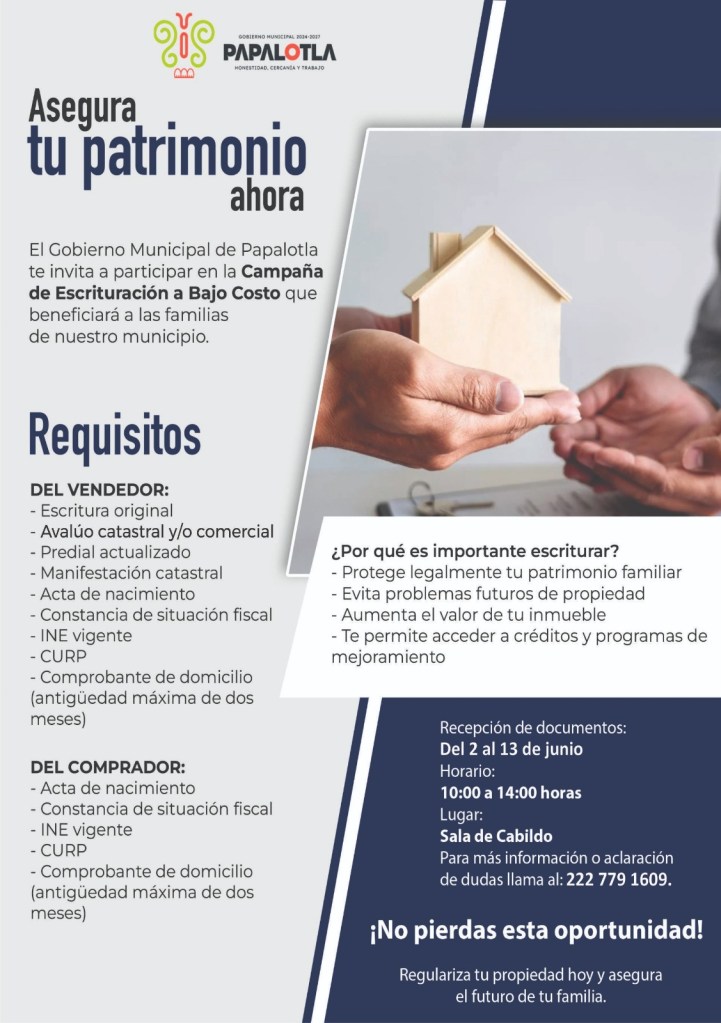 TLAXCALA, Tlax., 9 de junio de 2025.- El gobierno municipal de Papalotla anunció la extensión por una semana adicional de su exitosa Campaña de Escrituración a Bajo Costo, ampliando el plazo de recepción de documentos hasta el 13 de junio, en respuesta al gran interés mostrado por las familias del municipio para regularizar legalmente sus propiedades.