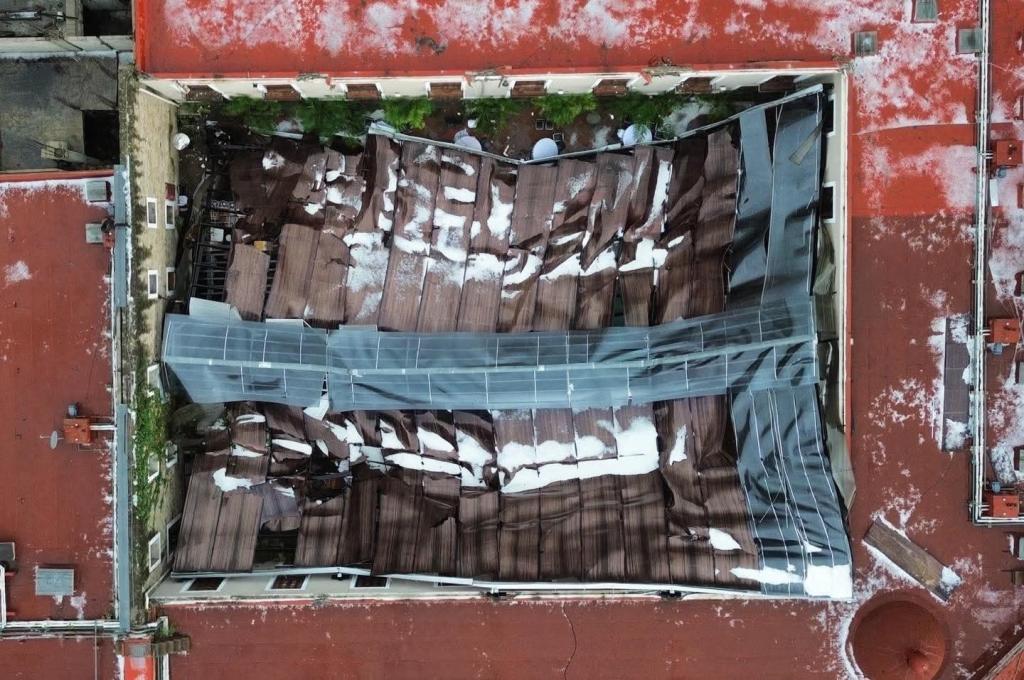 Específicamente se vino abajo la estructura metálica y los policarbonatos que integraban este techo en la zona de la alberca, tras no soportar el peso del granizo y agua que se acumuló encima.