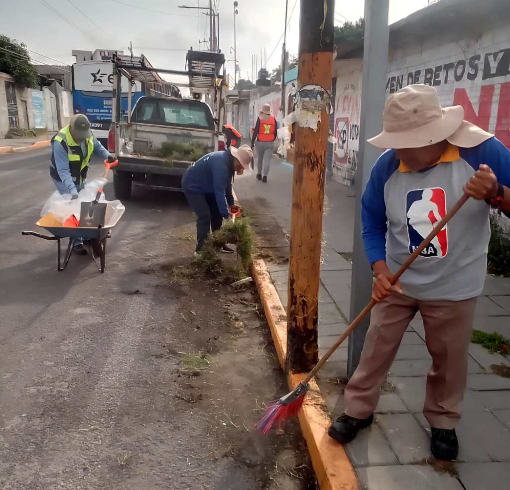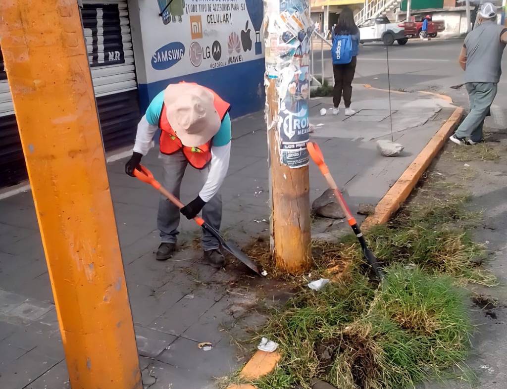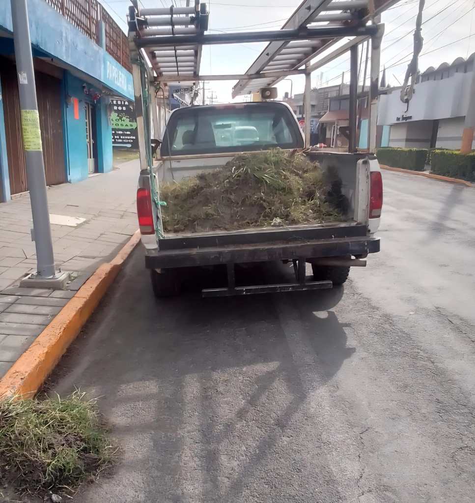 Los trabajos de rehabilitación comprenden el tramo que inicia desde el crucero de Papalotla hasta la vía corta, donde personal del área de Servicios Municipales se encarga de retirar la maleza que se ha proliferado sobre las banquetas y aceras.