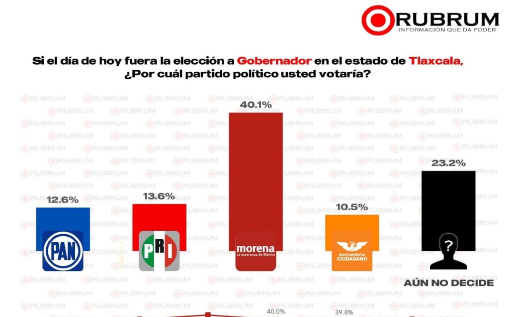 A estas cifras le siguen el partido Movimiento Ciudadano (MC), con un 9.1% y un 25.5% de tlaxcaltecas que aun no decide, es decir que se encuentran sin una opción viable en este momento.