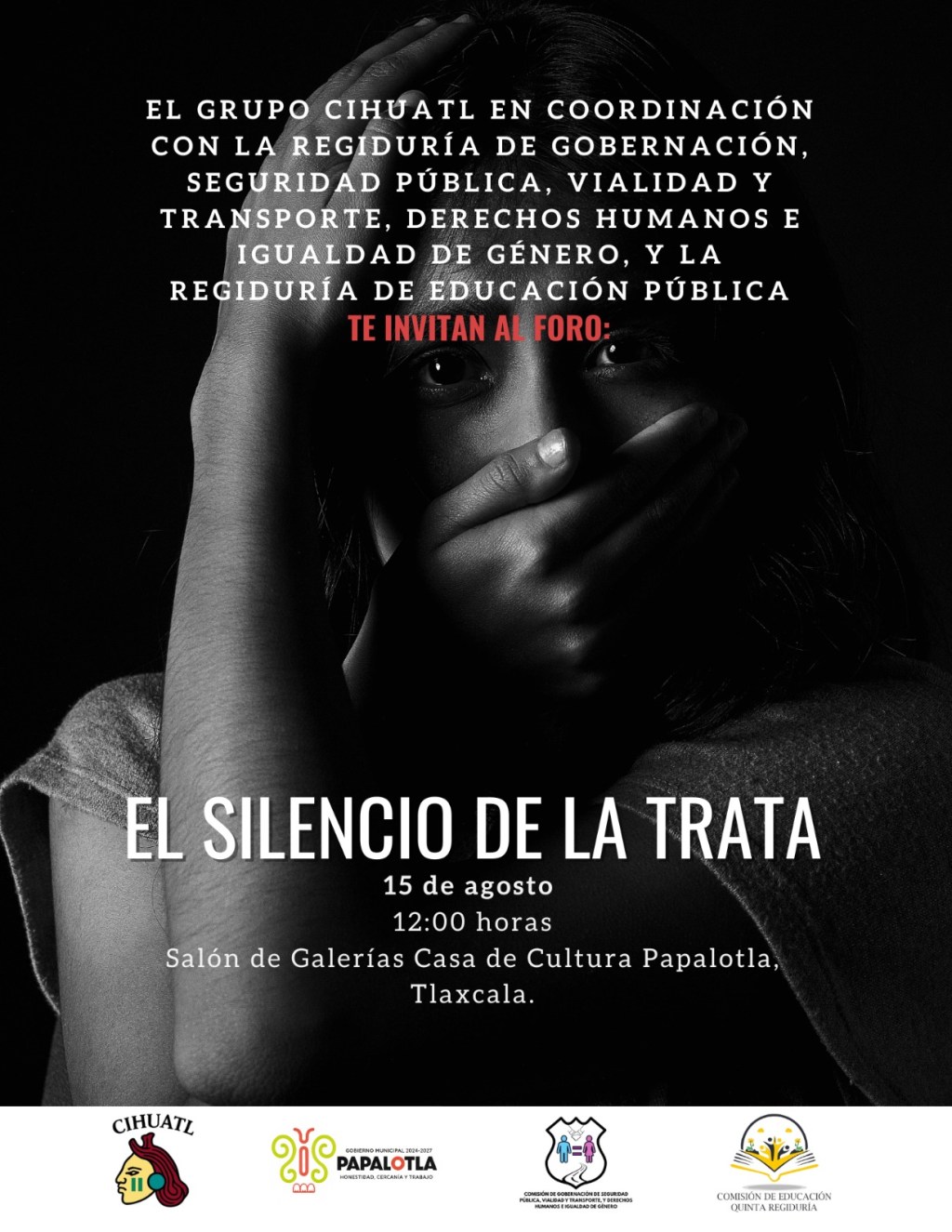 TLAXCALA, Tlax., 13 de agosto de 2025.- Las regidurías de Gobernación, Seguridad Pública, Vialidad y Transporte, Derechos Humanos e Igualdad de Género y la de Educación Pública del Gobierno Municipal de Papalotla unirán esfuerzos con el grupo Cihuatl, para realizar el foro “El Silencio de la Trata”, programado para el próximo 15 de agosto en el Salón de Galerías del Centro Cultural Papalotla.