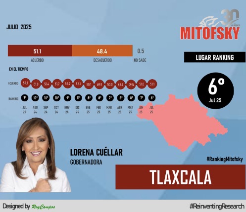 De acuerdo al reporte de julio 2025, la mandataria tlaxcalteca se ubica en la sexta posición de los gobernadores mejor evaluados, en la cuarta posición de mandatarios afines a la 4T y en la quinta de las gobernadoras de México.