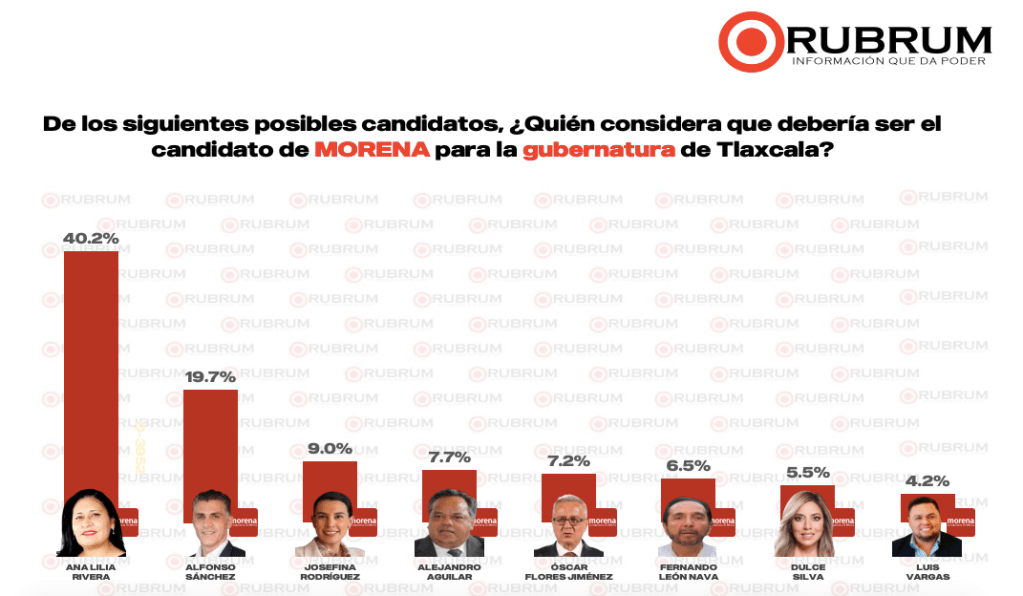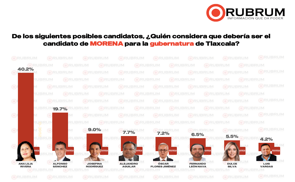 TLAXCALA, Tlax., 23 de agosto de 2025.- A Morena nadie lo para tiene el 40.3% de las preferencias rumbo al proceso electoral de 2027 y la mejor posicionada dentro de este partido es Ana Lilia Rivera Rivera con el 40.2% de las preferencias, el más cercano es Alfonso Sánchez García con apenas el 19.7%, según la última encuesta de la empresa demoscópica Rubrum elaborada en el mes de agosto de 2025.