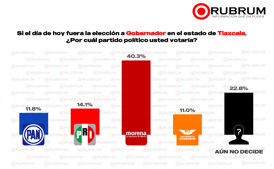 Finalmente, destacar que esta encuesta fue elaborada por Rubrum para conocer las tendencias de posibles precandidatos a la gubernatura de Tlaxcala rumbo al 2027, esta fue una encuesta realizada de manera telefónica en el 18 de agosto de 2025, con una población muestra aleatoria de hombres y mujeres habitantes del estado de Tlaxcala, el nivel de confianza es del 95% y el margen de error es de +/-3.8%.