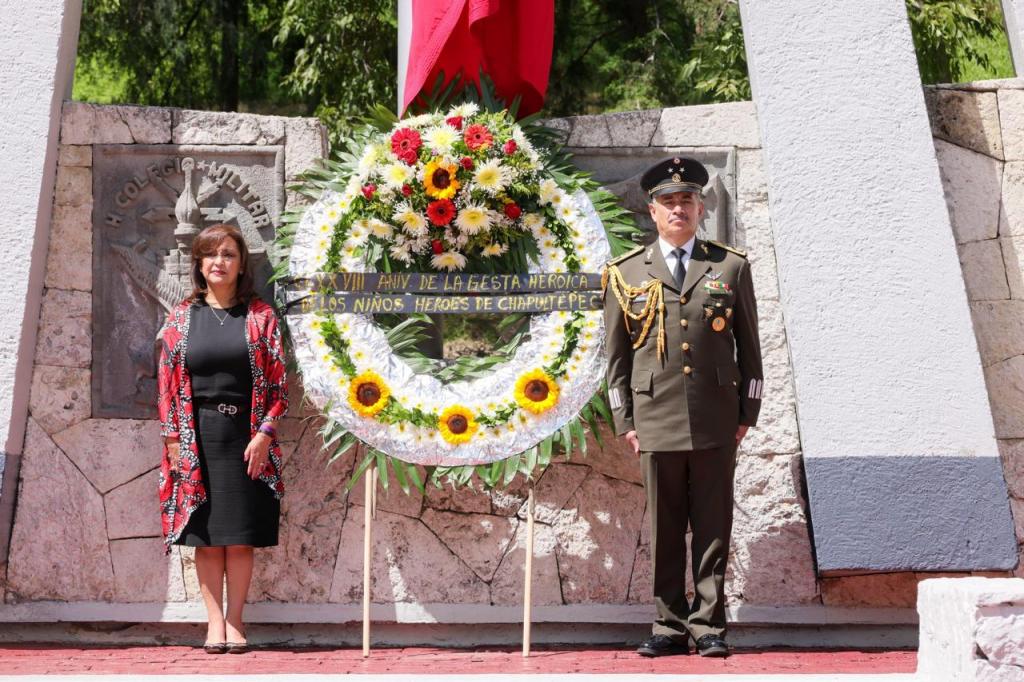 Posteriormente, la gobernadora Lorena Cuéllar y el comandante de la 23 zona militar, general Martín Jaramillo depositaron una ofrenda floral y montaron guardia de honor frente al monumento de los Niños Héroes.