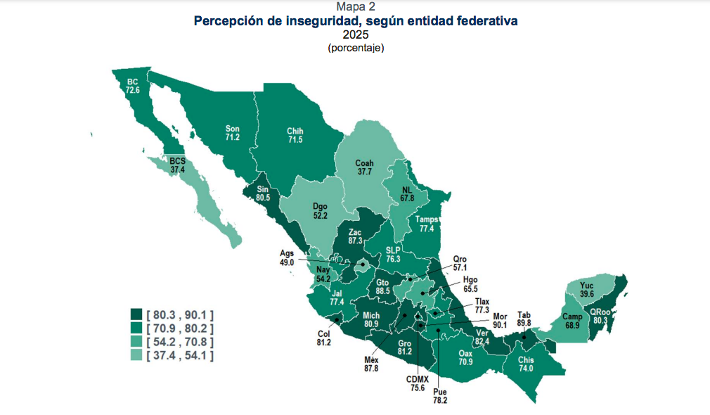 Las entidades con mayor percepción de inseguridad son: Morelos con 90.1%; Tabasco con 89.8%, Guanajuato con 88.5%.