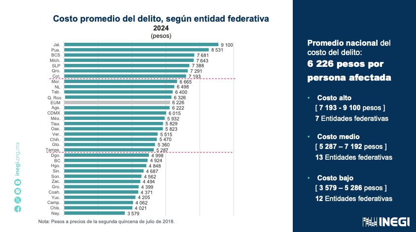 A nivel nacional el costo del delito e inseguridad en los hogares de México se estimó en 269.6 mil millones de pesos (mmdp) al cierre del año de 2024, lo que significó que cada persona afectad por un delito perdió 6 mil 226 pesos. El INEGI precisó que esta cifra representa un 1.07% del Producto Interno Bruto (PIB).