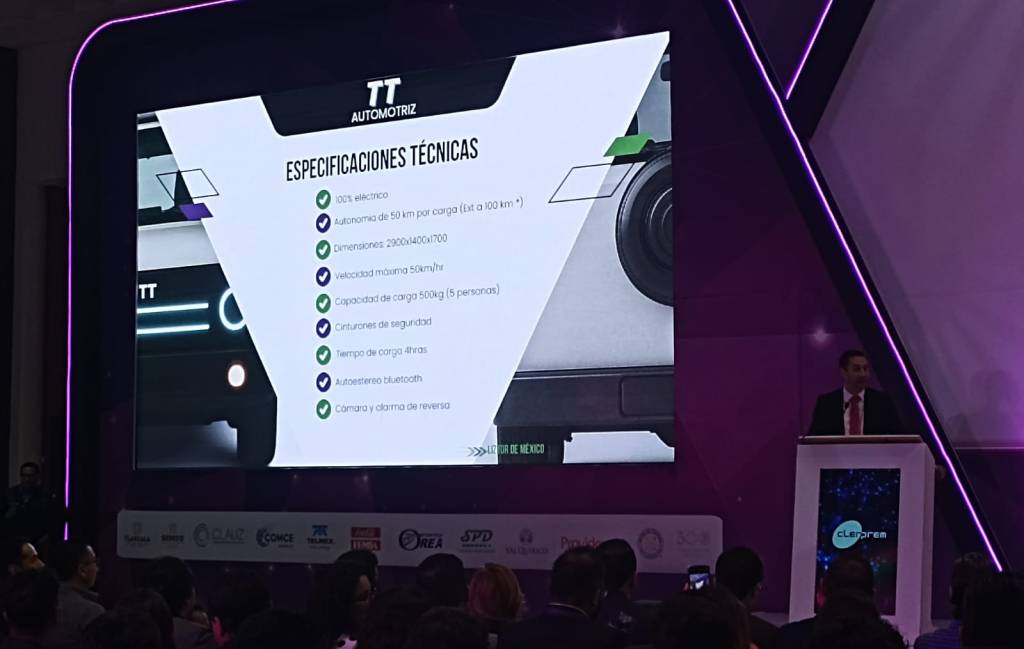 Dentro de las especificaciones técnicas, se detalló que es 100% eléctrico, tiene una velocidad máxima de 50 kilometros por hora, capacidad de carga de 500 kilogramos es decir, capacidad para cinco personas), el tiempo de carga o recarga es de cuatro horas, cuenta con cinturones de seguridad, autoestereo bluetooth, cámara y alarma de reversa.
