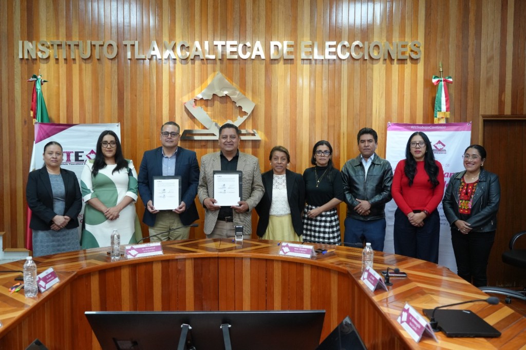Por ello, el colegiado del ITE recibió este martes a los presidentes municipales de Tetla de la Solidaridad, Giovani Montiel López; de Tzompantepec, Marcelino Ramos Montiel; y de Teolocholco, Valentín Meléndez Tecuapacho, acompañado de la Síndica, Lilia Salamanca Xicohtencatl, quienes firmaron el documento.