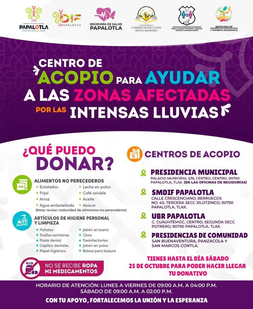 TLAXCALA, Tlax., 22 de octubre de 2025.- El gobierno de Papalotla instaló seis centros de acopio para recibir donaciones destinadas a las zonas del país afectadas por las intensas lluvias. La campaña acepta alimentos no perecederos y artículos de higiene personal, con plazo límite hasta el 25 de octubre.
