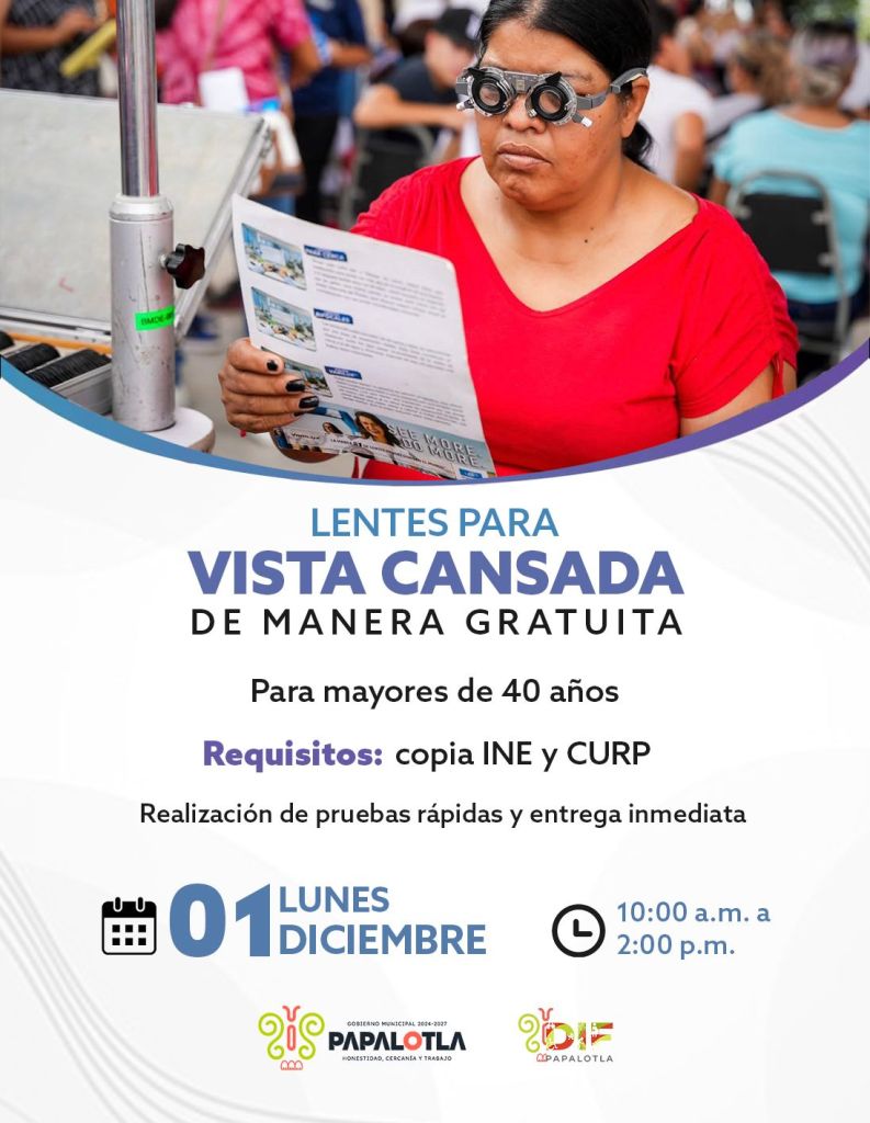 TLAXCALA, Tlax., 30 de noviembre de 2025.- A través del apoyo del Sistema Estatal para el Desarrollo Integral de la Familia (SEDIF) y la gestión efectuada por el DIF municipal, personas mayores de 40 años de Papalotla podrán recibir lentes gratuitos para vista cansada en una jornada que se realizará este lunes 1 de diciembre.