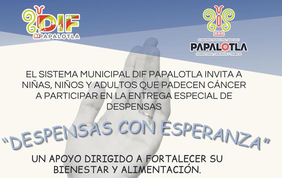 TLAXCALA, Tlax., 9 de diciembre de 2025.- El Sistema Municipal para el Desarrollo Integral de la Familia (Smdif) de Papalotla realizará una Jornada Especial de Apoyo Único de Despensa dirigido a niñas, niños y adultos del municipio que padecen cáncer y que requieren fortalecer su bienestar nutricional durante sus tratamientos médicos.