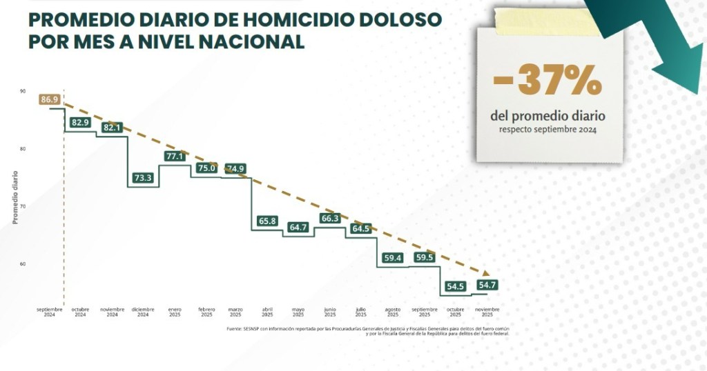 La mandataria federal detalló que, en ese periodo, el promedio de víctimas diarias pasó de 86.9 a 54.7, lo que representa 32 homicidios diarios menos, ubicando a noviembre de 2025 como el mes más bajo desde 2015, por lo que subrayó que el resultado de homicidios a lo largo de estos meses es muy importante.