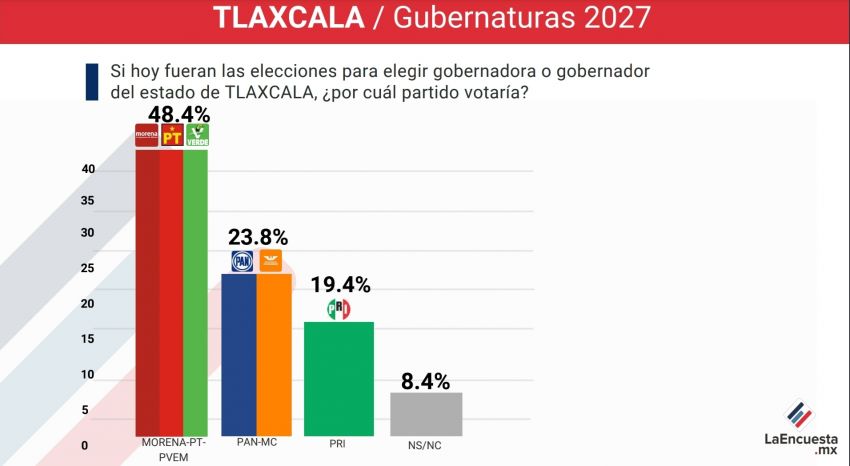 Según el sondeo, Morena por sí mismo tiene la preferencia del 40.1 por ciento de la población; mientras que el Partido del Trabajo (PT), tiene el 3.1 por ciento de respaldo y el Verde Ecologista de México (PVEM), con el 2.3 por ciento, esta cifra hace que peligre su registro como instituto político.