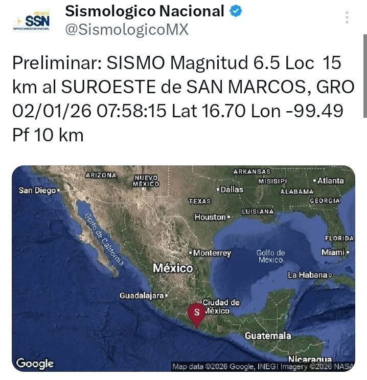 De acuerdo con los primeros reportes del Servicio Sismológico Nacional (SSN), el movimiento telúrico ocurrió a las 07:58 a.m., con epicentro a 15 kilómetros al suroeste de San Marcos en el estado de Guerrero y una profundidad de 10 kilómetros, por lo que fue catalogado como extremo.